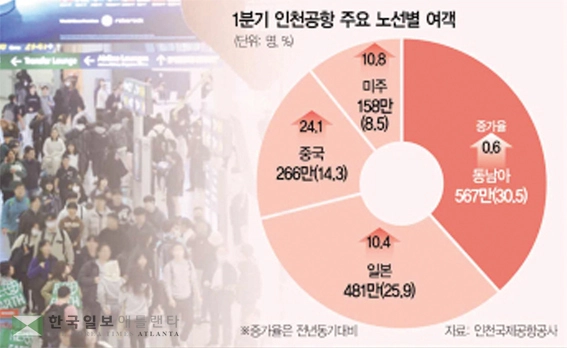 대표적인 단거리 노선인 동남아 노선은 567만 명의 여객을 수송해 가장 큰 비중인 30.5%를 기록했다. 일본행 여객 또한 481만 명으로 전체의 25.9%를 차지했다. 1년 전과 비교하면 10.4% 늘어났다. 미주 여객은 158만 명으로 전년 동기 대비 10.8% 증가했다. 반면 호주 등 대양주행 여객은 68만 명으로 지난해 1분기보다 12.9% 줄어들었다.