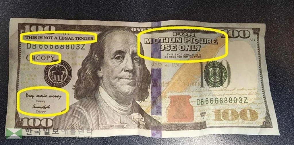 경찰은 23일 "영화 촬영 전용"(Motion Pictures Use Only)과 "소품은 우리가 신뢰합니다"(in PropWe Trust)라는 문구가 적힌 위조 지폐에 대한 신고를 접수했다고 밝혔다.
