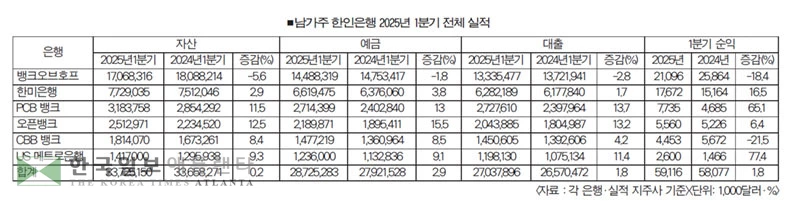 27일 남가주에 본점을 둔 뱅크오브호프와 한미은행, PCB 뱅크, 오픈뱅크, CBB 뱅크, US 메트로 은행 등 6개 한인은행들이 모두 실적을 발표한 가운데 이들 한인들의 1분기 순익은 총 5,911만달러를 기록했다. 이는 전년 동기인 2023년 1분기의 5,807만달러 대비 1.8% 증가한 것이다. (도표 참조)