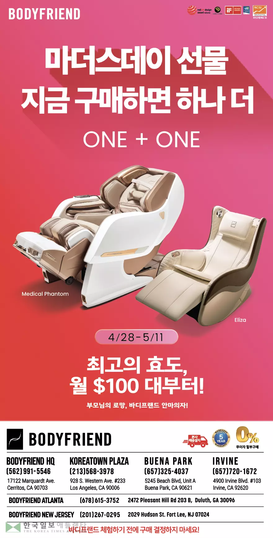 바디프랜드 미주법인 관계자는 “마더스데이를 맞아 평소 부모님께 감사의 마음을 전하고 싶었던 분들께 최고의 헬스케어 선물을 드릴 수 있는 기회”라며, “세계 최고 수준의 안마의자가 전하는 편안함과 건강한 휴식을 통해 많은 고객들이 가족의 소중함을 다시 한번 느끼길 바란다”고 말했다. 이어 “1+1 프로모션인 만큼 파격적인 혜택과 철저한 서비스로 미주 고객들의 성원에 보답하겠다”고 덧붙였다.