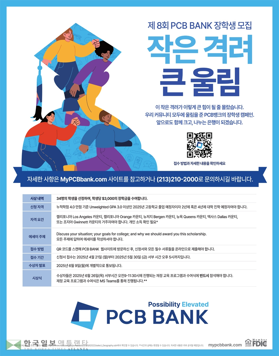 올해 장학금 모집은 더욱 확대되어 캘리포니아의 로스앤젤레스와 오렌지 카운티, 뉴욕 퀸즈, 뉴저지 버건, 텍사스 달라스, 그리고 오는 6 월 신규 지점이 오픈하는 조지아 귀넷카운티까지 포함하는 전국적인 규모로 성장했다. 올해 34 명의 장학생이 선발되면 PCB 뱅크는 8 년간 총 197 명의 청소년에게 57만 달러의 든든한 장학금을 지원하게 된다.