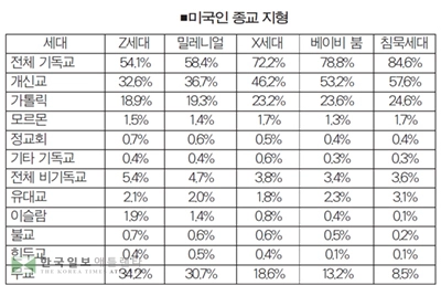 갤럽은 미국의 종교지형이 21세기 들어 뚜렷하게 재편되고 있다고 분석했다. 2000~2004년 조사에서는 미국 성인의 84%가 기독교 신자였으나, 20년 뒤인 지금은 69%로 하락했다. 이 같은 변화는 주로 종교가 없는 젊은 세대가 성인이 되면서 발생한 것이다.