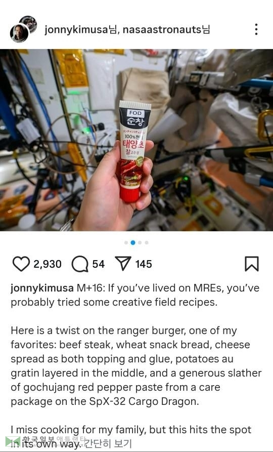 한국계 미국인으로 '인간 승리' 서사를 써온 우주 비행사 조니 김(41)이 국제우주정거장(ISS)에서 즐긴다는 '고추장 버거'를 "가족의 맛"이라고 소개했다.