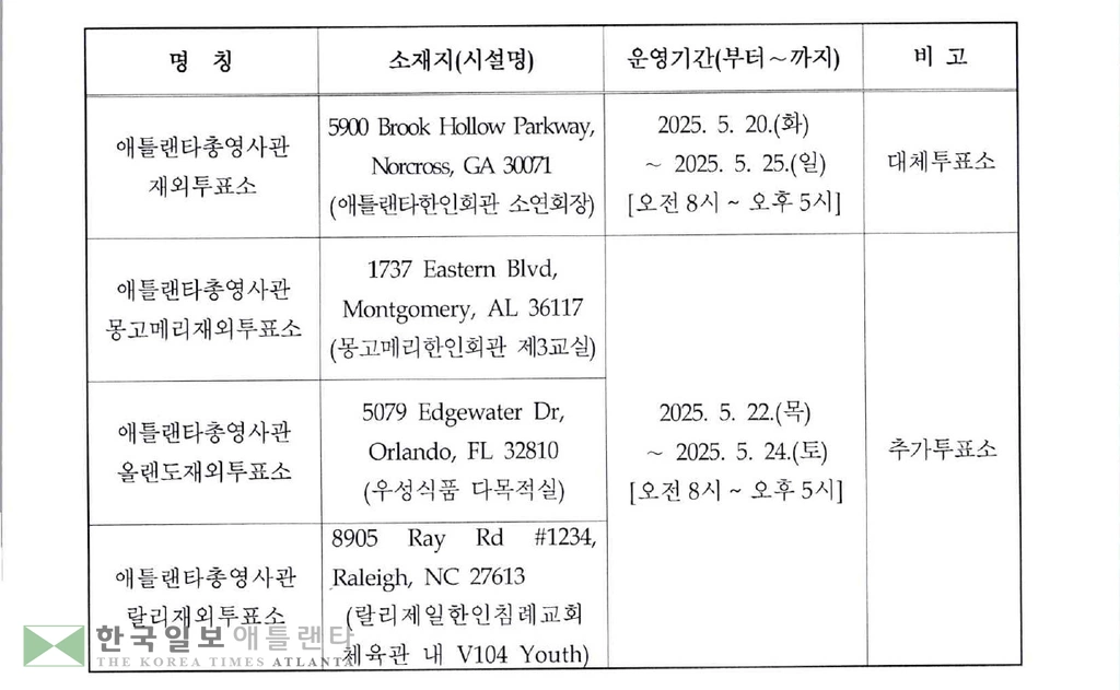 투표소 운영기간은 대체투표소인 애틀랜타한인회관의 경우 5월 20-25일 오전 8시-오후 5시, 추가투표소인 나머지 세 곳은 5월 22-24일 오전 8시-오후 5시이다.