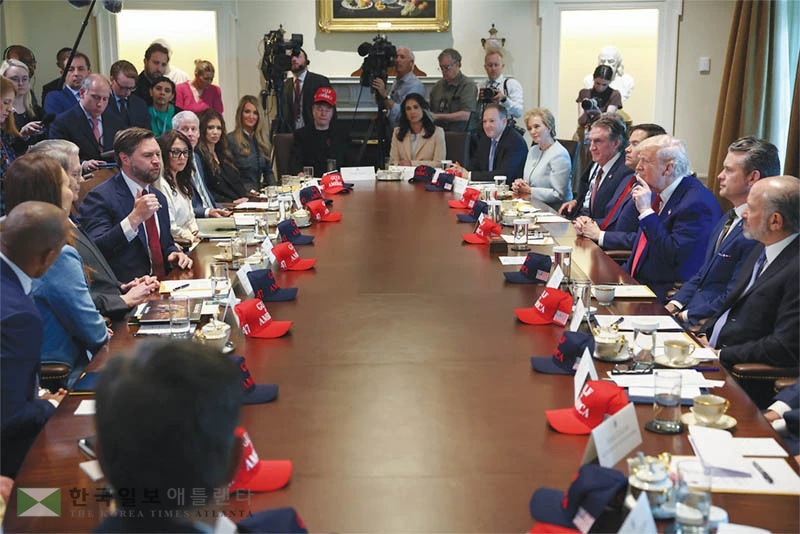 지난달 29일로 2기 취임 100일이 지난 도널드 트럼프 대통령이 다음날인 30일 백악관에서 각료회의를 개최하고 있다. 이날 회의 테이블의 각 각료들 앞에‘마가(MAGA·미국을 다시 위대하게)’ 모자를 연상케 하는 빨간색과 검은색 모자가 놓여 있었다. 이 모자에는 트럼프 대통령이 미국 우선주의를 내세우며‘멕시코만’에서 명칭을 바꾼 ‘미국만(Gulf of America)’라는 글씨가 쓰여 있다.