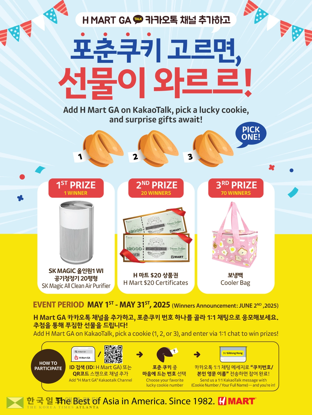 본 행사는 5월 1일부터 5월 31일까지 H 마트 조지아 채널을 추가한 지역 거주 고객을 대상으로 진행된다. 행사에 참여하기 위해서는 카카오톡 H Mart Georgia 채널을 추가한 뒤, 행사 포스터 속 포춘쿠키 번호를 하나 선택해 참여자의 영문 이름과 함께 1:1 채팅창으로 보내면 된다.