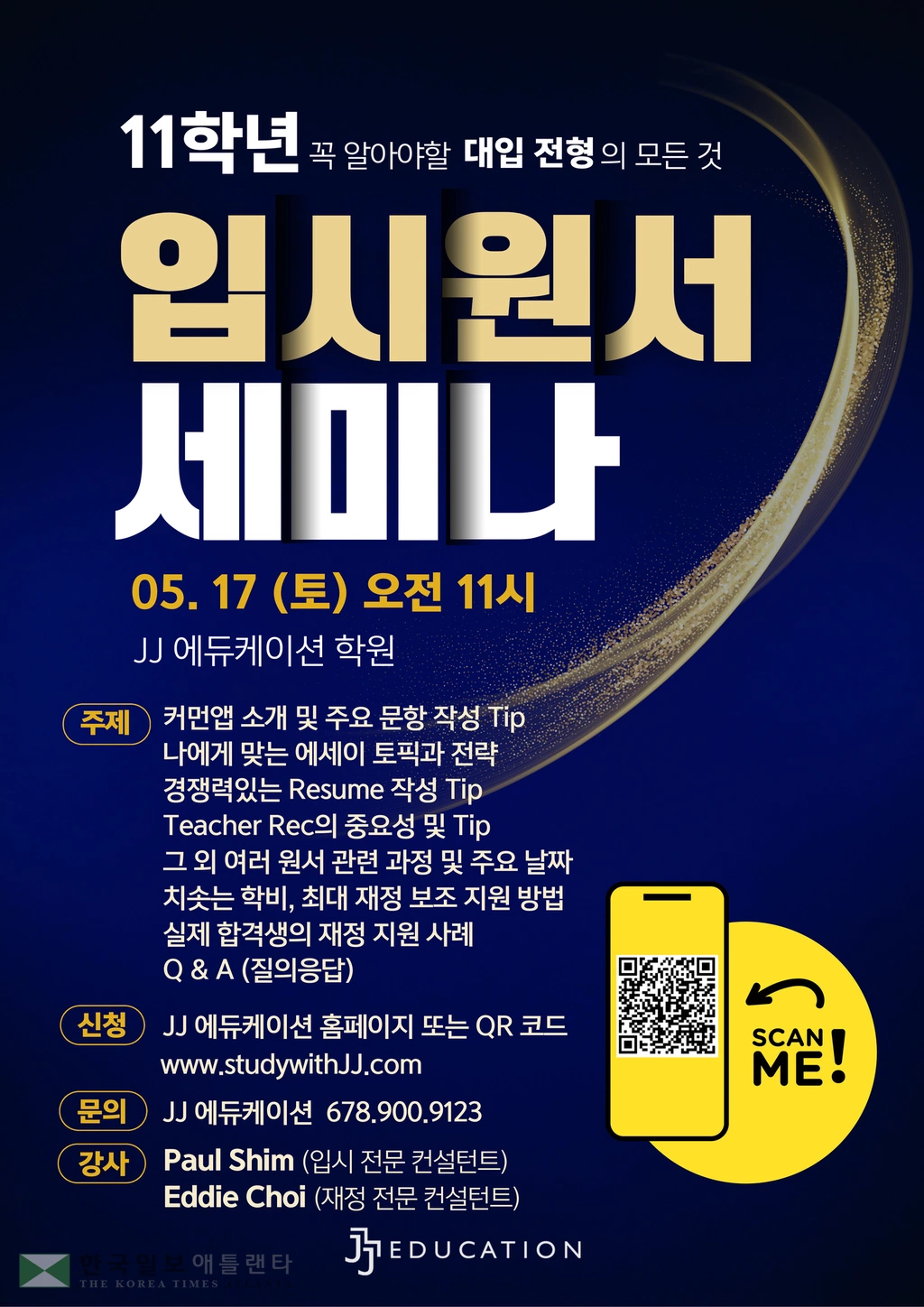 대입전문 JJ 에듀케이션이 5월 17일 오전 11시 스와니 학원에서 11학년을 대상으로 '입시원서 세미나'를 개최한다.