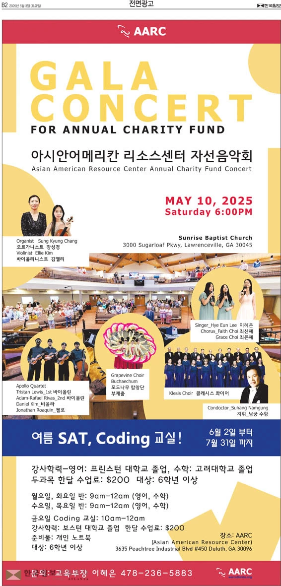 아시안아메리칸 리소스센터 기금모금을 위한 자선음악회가 5월 10일 오후 6시 썬라이즈 침례교회(3000 Sugarloaf Pkwy, Lawrenceville)에서 열린다. 문의=478-236-5883.