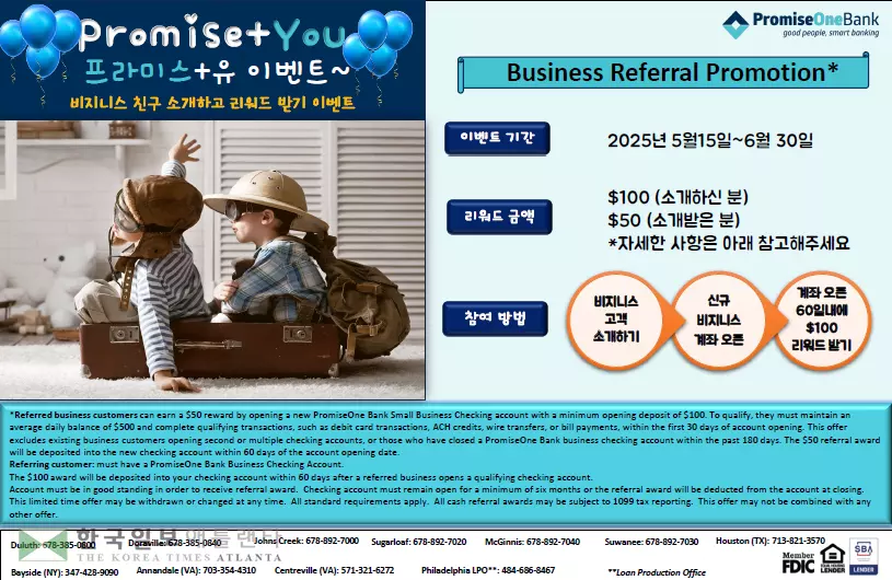 이번 프로모션은 기존 프라미스원 은행의 비즈니스 체킹 계좌 고객이 새로운 비즈니스 고객을 소개하고, 소개받은 고객이 프라미스원 은행에서 스몰비즈니스 체킹 계좌를 개설할 경우, 소개한 고객에게는 100달러, 신규 계좌 개설 고객에게는 50달러의 리워드를 드리는 혜택을 제공한다. 이는 지역 내 스몰비즈니스 간의 협력과 성장을 장려하고, 프라미스원 은행의 고객 네트워크를 더욱 확대하고자 하는 취지에서 기획됐다.
