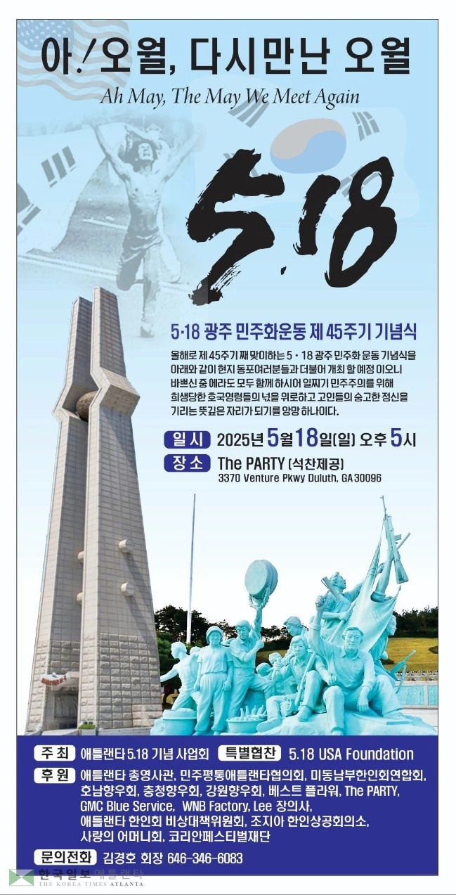 애틀랜타 5.18기념사업회 주최로 5월 18일(일) 오후 5시 둘루스 '더 파티'(3370 Venture Pkwy NW, Duluth, GA 30096)에서 기념식이 열린다. 문의=김경호 회장 646-346-6083.