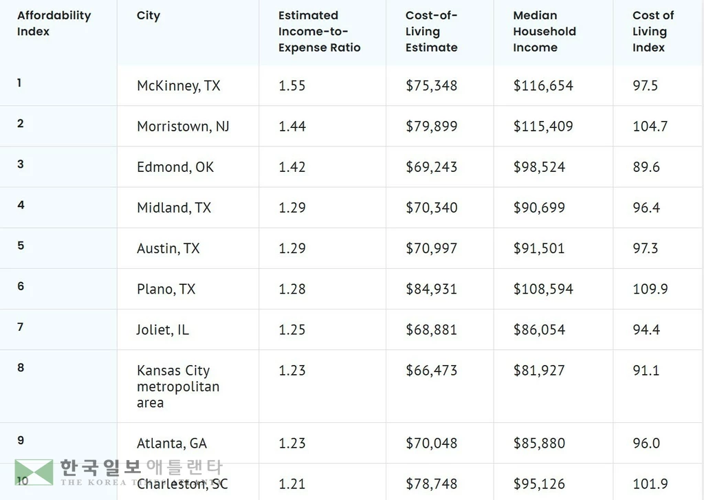 1위는 텍사스의 맥키니가 선정됐고 모리스타운(뉴저지), 에드먼드(오클라호마), 미드랜드(텍사스), 어스틴(텍사스) 순을 기록했다. 상위 10위 안에 텍사스 소재 도시가 무려 4곳이나 선정돼 주목을 받았다.