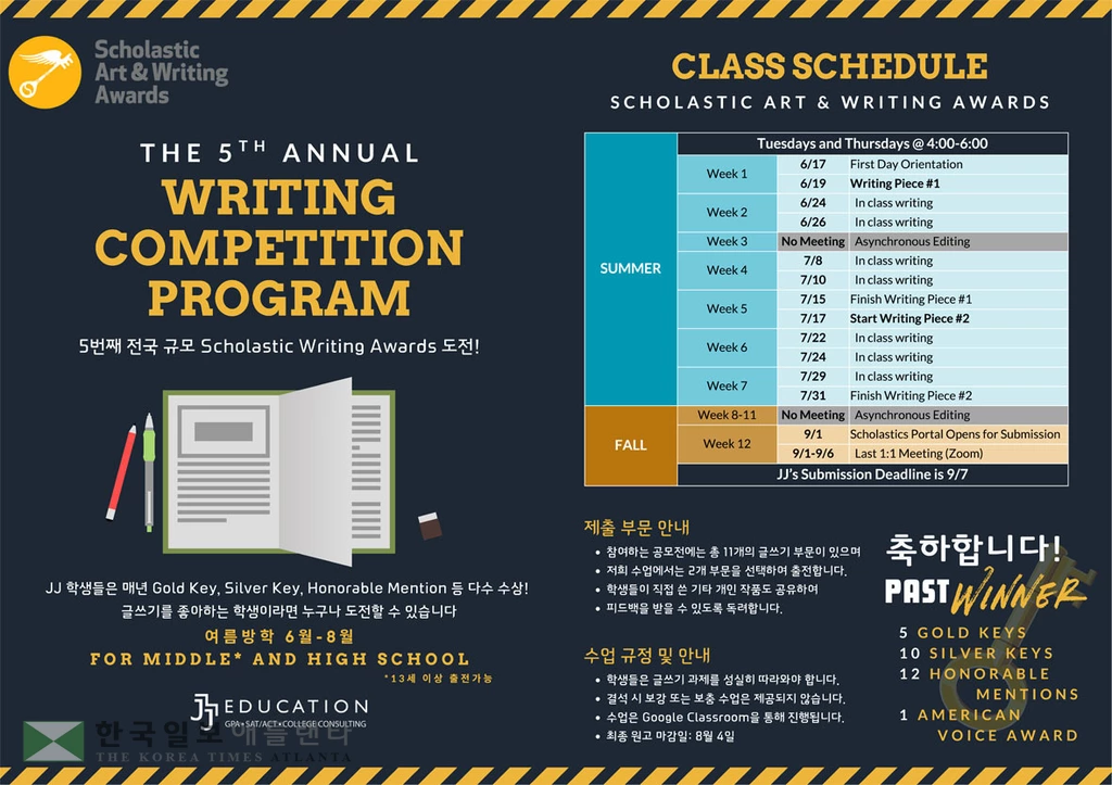 한편, JJ 에듀케이션은 오는 6월 17일부터 7월 31일까지 ‘제5회 라이팅 컴피티션 프로그램’을 진행하며 현재 참가자를 모집 중이다. 수업은 주 2회, 회당 2시간씩 진행되며, 8월에는 Asynchronous Editing이, 9월 1일부터 6일까지는 1:1 최종 줌(Zoom) 피드백이 예정되어 있다.