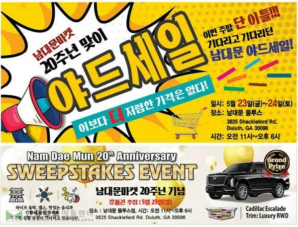 남대문마켓이 창립 20주년을 맞아 오는 오는 23일-24일 둘루스점에서 야드세일을 실시한다. 또한 25일에는 20주년 경품 이벤트 추첨 행사와 신나는 고객 사은 축하 행사를 개최한다.