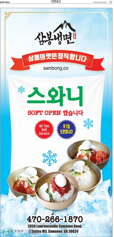 정직한 맛 삼봉냉면이 2호점을 스와니에 오픈했다. 또한 가맹점을 모집한다. 가맹 혜택으로 냉면 조리기술 전수 및 매장 운영 지원, 삼봉냉면 상호 및 지식재산권 등을 제공한다. 주소= 2850 Lawrenceville-Suwanee Rd suite m3, Suwanee, GA 30024 문의= 470-266-1870, 201-566-2773(가맹점 문의).