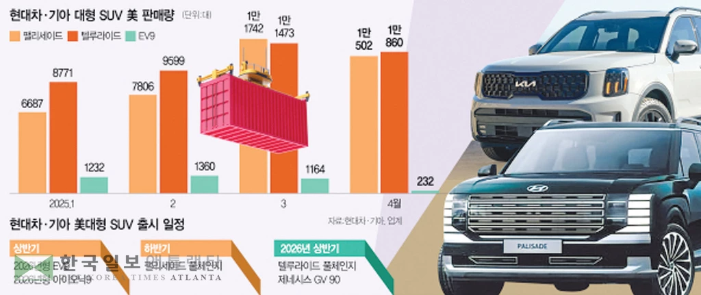 현대차 그룹이 미국 시장에서 인기가 높은 대형 스포츠유틸리티차량(SUV) 시장을 석권해 도널드 트럼프 정부의 관세 파고를 넘는 한편 북미 점유율을 확대해 가는 전략을 펼친다. 지난달 대형 전기 SUV인 아이오닉9을 현지에 처음 출시한 현대차그룹은 관세 부과에도 먼저 선보인 EV9에 대한 대대적인 할인 마케팅에 돌입했다. 현대차그룹은 하반기 대형 SUV인 팰리세이드 풀체인지 모델과 하이브리드를 추가한 텔루라이드 풀체인지 모델도 잇따라 공개한다.