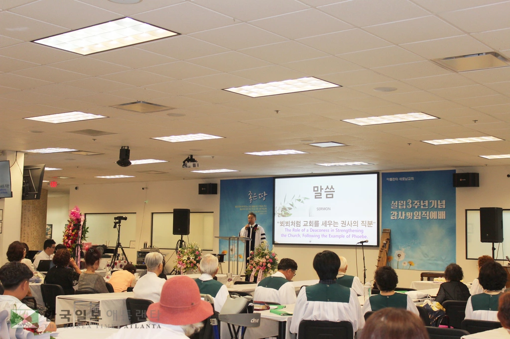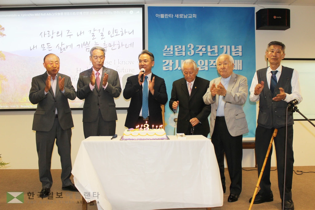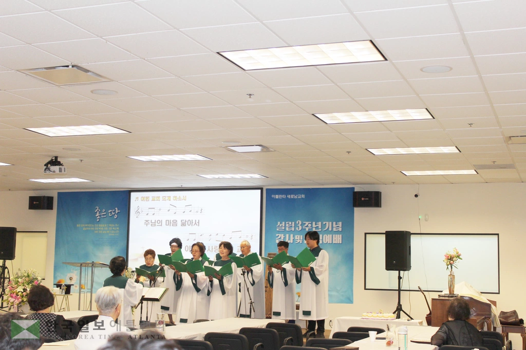 사랑이 풍성한 교회 아틀란타 새로남교회(담임 목사 장민욱)가 지난 15일 오전 11시 성도 및 외부 손님들이 모여 설립 3주년 감사예배를 드렸다. 1부는 감사 여배를 2부는 권사 임직 예식을 치렀다.