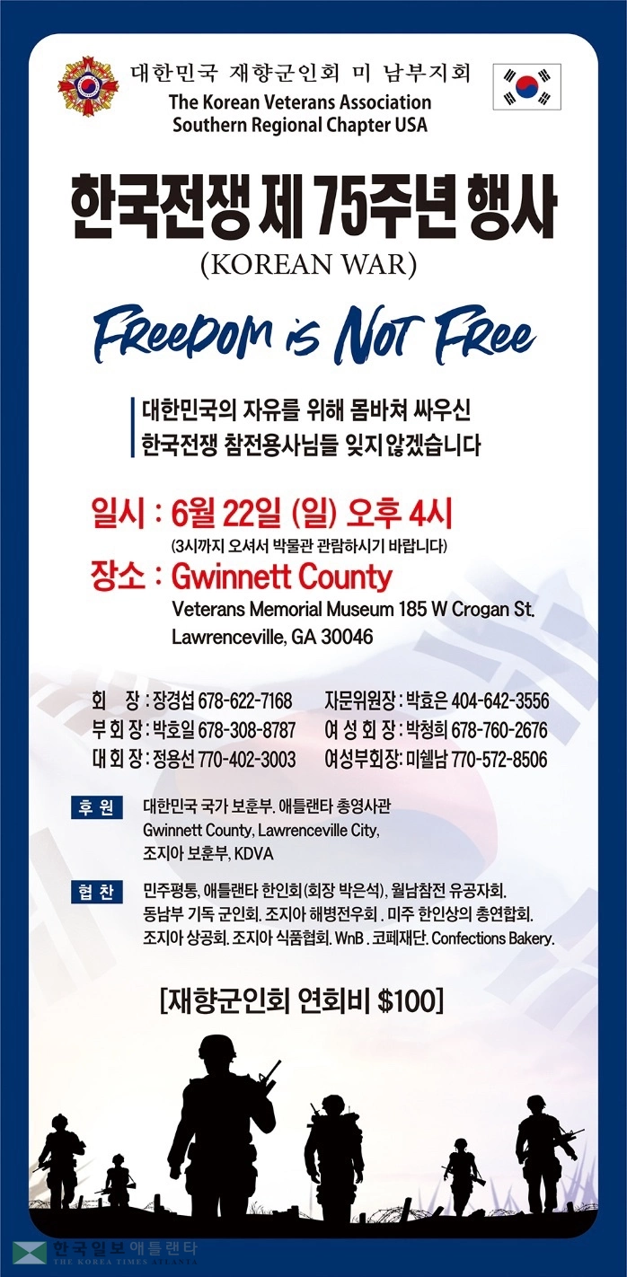 재향군인회 미남부지회(회장 장경섭)는 6월 22일 오후 4시 귀넷카운티 베테런스 메모리얼 뮤지엄(185 W Crogan St. Lawrenceville, GA 30046)에서 한국전 기념식을 개최한다. 문의=678-308-8787.