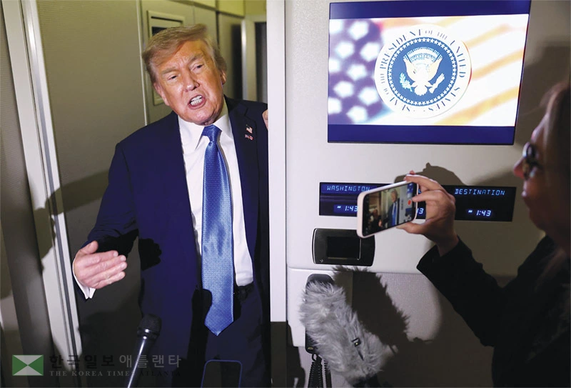 ![도널드 트럼프 대통령이 17일 긴급 귀국길 도중 대통령 전용기 에어포스 원 내부에서 취재진의 질문에 답하고 있다. [로이터]](/image/fit/284248.webp)