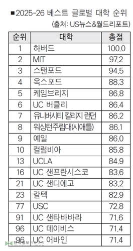 US 뉴스&월드리포트가 지난 17일 발표한 2025-2026 글로벌 최우수 대학(2025-2026 Best Global Universities) 순위에서 이들 미국 3대 대학이 상위 1~3위에 오른 가운데, 영국의 전통 명문 옥스포드대와 케임브리지대가 각각 4위와 5위로 뒤를 이었다.