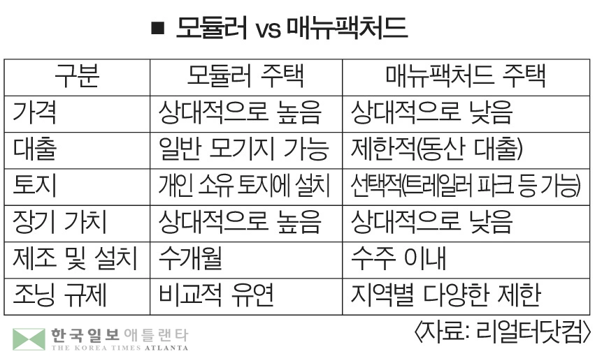 ▶건축 기준: 모듈러 주택은 각 지방 자치단체와 주정부의 건축 규정을 따른다. 반면 조립식 주택은 HUD 기준에 따라 제조된다. ▶설치 부지: 모듈러 주택은 일반적으로 소유한 토지 위에 고정식 기초를 두고 설치된다. 반면 조립식 주택은 임대 부지나 소유 부지 모두 설치가 가능하며 다른 부지로 이동도 할 수 있다. ▶대출 조건: 모듈러 주택은 일반 주택과 동일한 방식으로 모기지 대출이 가능하다. 그러나 조립식 주택은 토지에 고정돼 있지 않으면 전통적인 모기지 대출을 받기가 어렵고, ‘동산 대출’(Chattel loan) 같은 특정 대출을 신청해야 한다. ▶재판매 가치: 모듈러 주택은 일반 주택처럼 시간이 지날수록 가치가 상승하는 경향이 있다. 반면 조립식 주택 중 토지에 고정돼 있지 않은 경우, 시간이 지나면서 가치가 떨어질 수 있다.