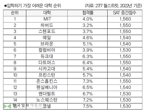 미국에서 가장 입학하기 어려운 대학 1위는 MIT로 나타났다. 경제매체 ‘24/7 월스트릿’이 최근 발표한 입학하기 어려운 미국 대학 순위에서 MIT가 1위에 올랐다. 이 매체는 지난 2022년 가을학기 신입생 기준 합격률 및 SAT 중간 점수 등을 기준으로 입학하기 가장 어려운 대학 상위 50곳을 조사했는데 1위 MIT, 2위 하버드, 3위 스탠포드 등의 순으로 평가됐다.
