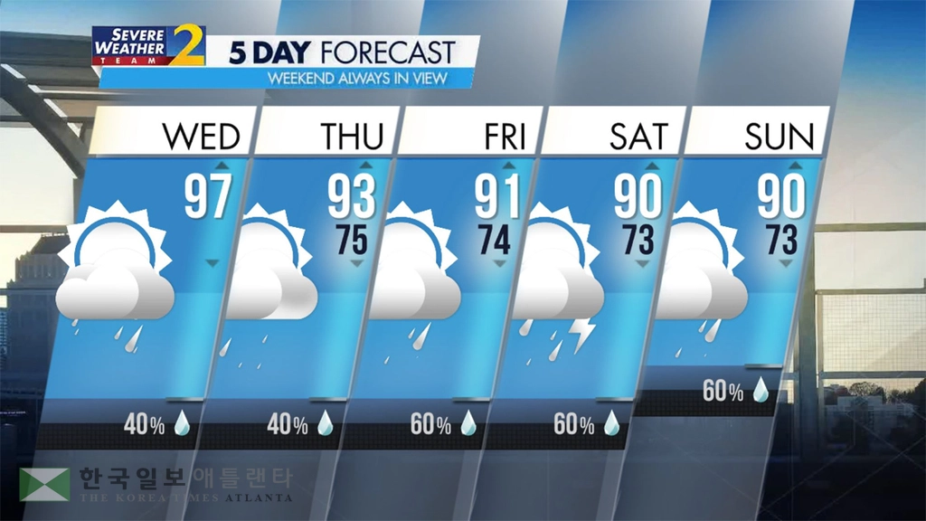 조지아 전역에 체감온도 100~110도에 달하는 극심한 무더위가 예고되면서 24일과 25일 메트로 애틀랜타에 ‘폭염 주의보(Heat Advisory)’가 발령됐지만 목요일인 26일부터 약 일주일 정도는 거의 매일 소나기가 예보돼 폭염이 약간 누그러질 것으로 예보됐다.