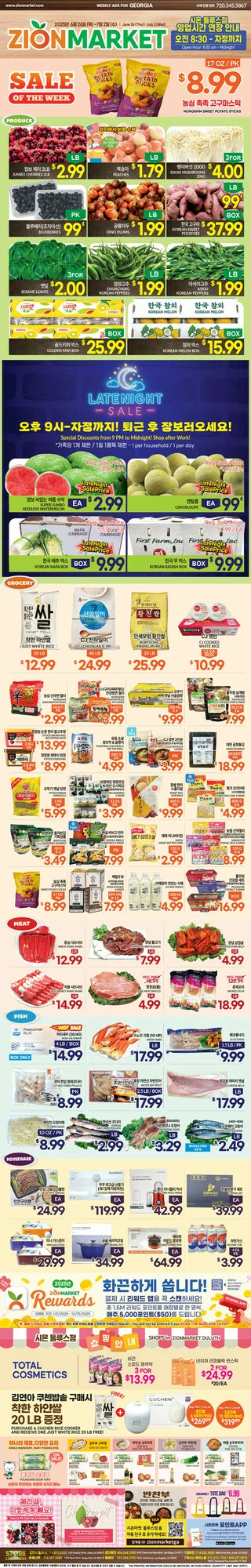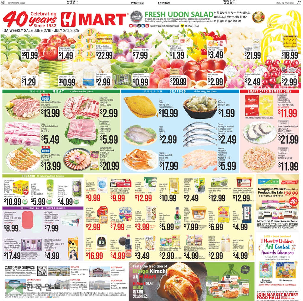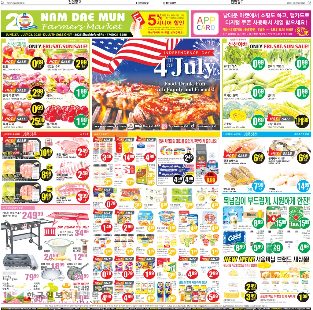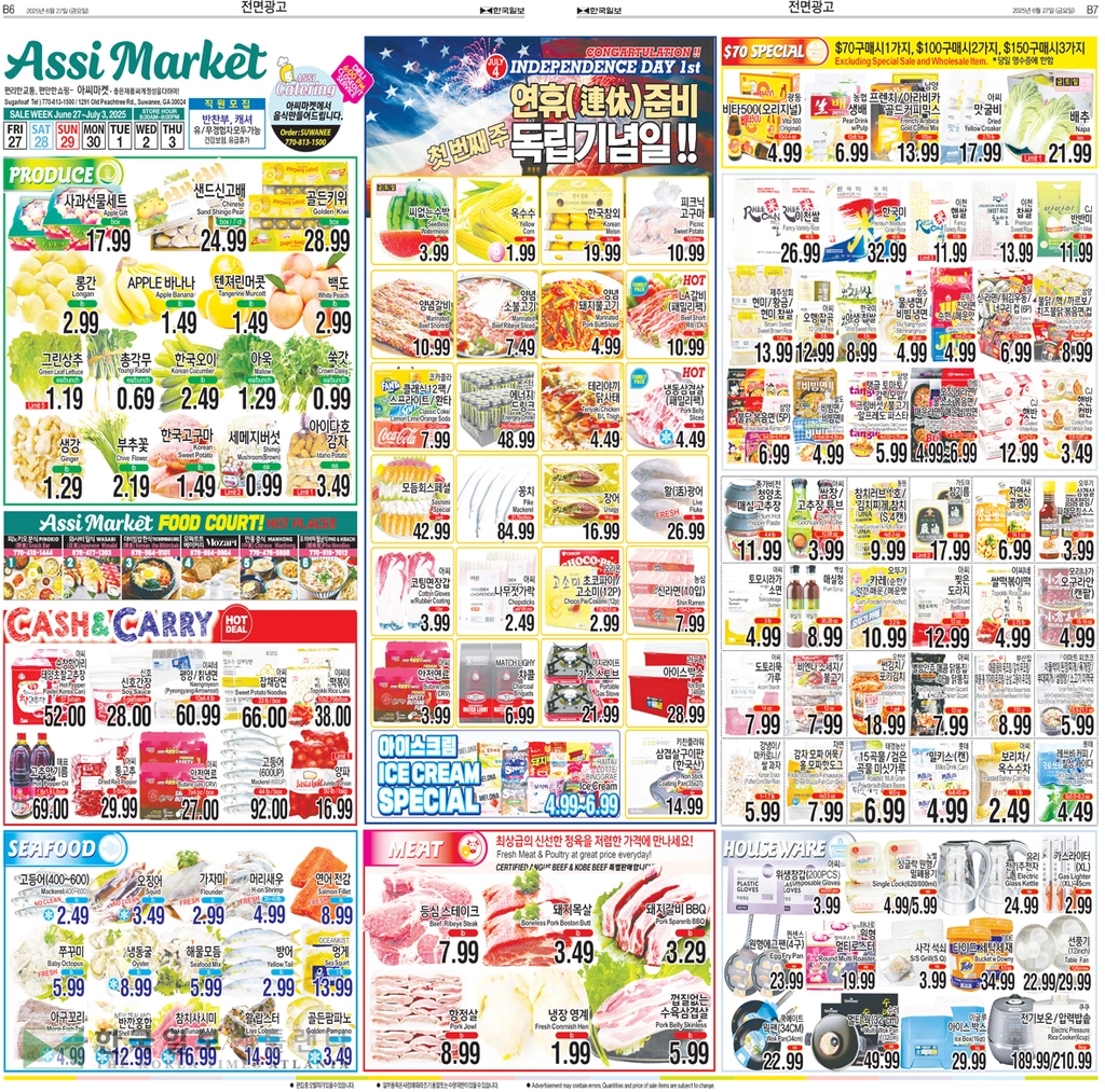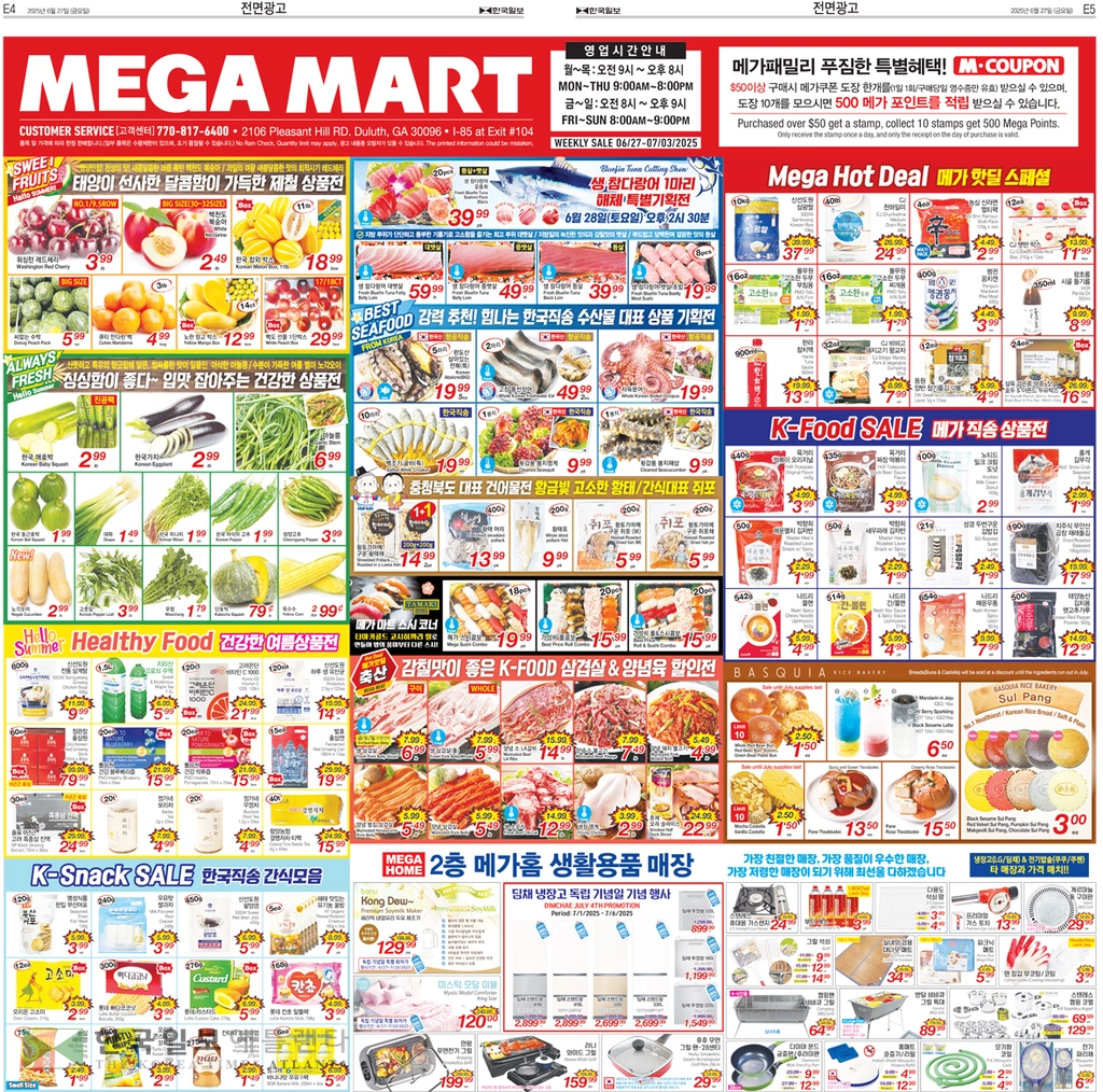 이번주 메인품목으로는 씨 없는 수박EA 3.99, 옥수수EA/5FOR. 1.99, 한국참외(BOX )EA 19.99, 피크닉 고구마(10LB,BAG) EA 10.99,코카콜라 클래식 12팩7.99, 몬스터 에너지드링크 24캔 (박스) 48.99, 오리온 초코파이16.5OZ 2.99, 고소미 (12P) 7.62 OZ 2.99, 농심 신라면(10입) 7.99, 양념 갈비LB 10.99,양념소불고기LB 7.49, 양념돼지불고기LB 4.99, 냉동삼겹살(패밀리팩) LB 4.49, LA갈비(패밀리팩) LB 10.99, 낙엽살 로스구이 LB 9.99, 생 차돌박이 LB 12.99, 갈비선물세트SET 149.99, 모듬회스페셜PACK 42.99, 활 광어LB 26.99, 장어 (14 OZ) EA16.99, 꽁치(21.70 OZ,BOX) EA 84.99, 아씨 코팅면장갑1 0 PR 3.99, MATCH LIGHY 챠콜(4LB) EA 6.99 등이 선보인다.