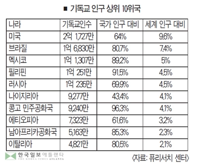 국가별로는 미국이 여전히 세계에서 가장 많은 기독교인을 보유하고 있으며, 전체 인구의 약 64%가 기독교인이다. 한때 기독교 인구 급증으로 주목받았던 중국의 기독교 인구는 2020년 기준 약 2,500만 명으로 추정되며, 상위 10위권 밖으로 조사됐다. 종교 자유에 대한 강력한 탄압에도 불구하고 기독교 인구가 꾸준한 성장세를 보이고 있지만 규모 면에서는 아직 크지 않다는 분석이다. 한편, 이번 조사에서 기독교 인구 상위 10개 국가가 전 세계 기독교인의 47%를 차지하는 것으로 나타났다. <도표 참고>