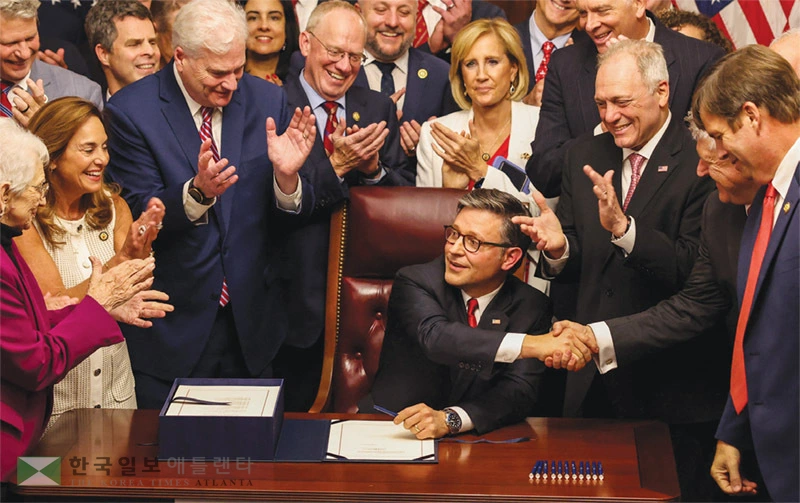 ![마이크 존슨 연방하원의장이 3일 공화당 의원들이 박수를 치는 가운데 연방 하원에서 통과된 트럼프 감세법안에 서명하고 있다. [로이터]](/image/fit/284706.webp)