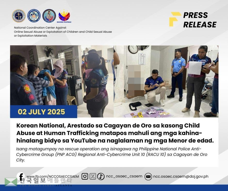필리핀 GMA뉴스 등에 따르면 필리핀 온라인 아동 성 착취 및 아동 성학대물 대응 국가조정센터(NCC-OSAEC-CSAEM)는 지난달 카가얀 데 오로시에서 미성년자에 대한 착취 및 학대, 인신매매 등의 혐의로 지난달 한국인 남성 A씨를 체포했다고 밝혔다.