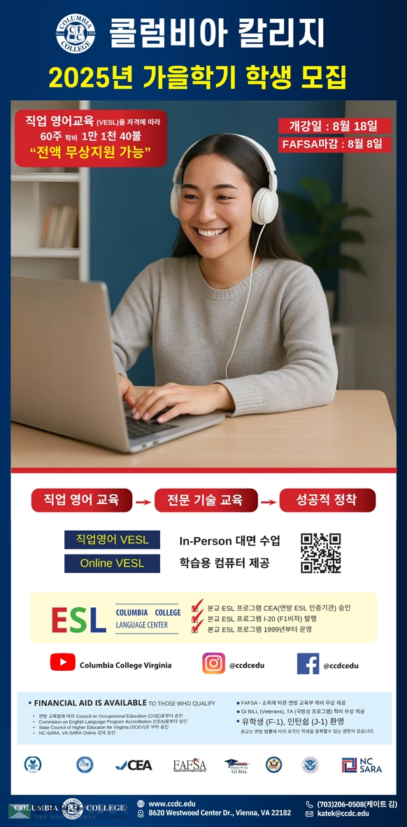 60주 과정의 직업 영어교육 클래스를 8월 18일 개강하며, 자격에 따라 전액 무상지원도 가능하다.팹사 지원 마감일은 8월 8일까지다. 수업은 대면 혹은 온라인 수업으로 진행한다. 자세한 정보는 www.ccdc.edu에서 얻을 수 있으며, 문의전화는 703-206-0508.