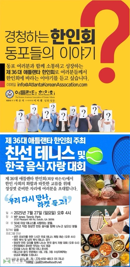 한편 한인회는 한인회에 바라는 동포들의 이야기를 경청하기 위해 이메일로 동포들의 의견을 접수하고 있다. 의견을 보낼 곳은 info@AtlantaKoreanAssociation.com이다. 박요셉 기자