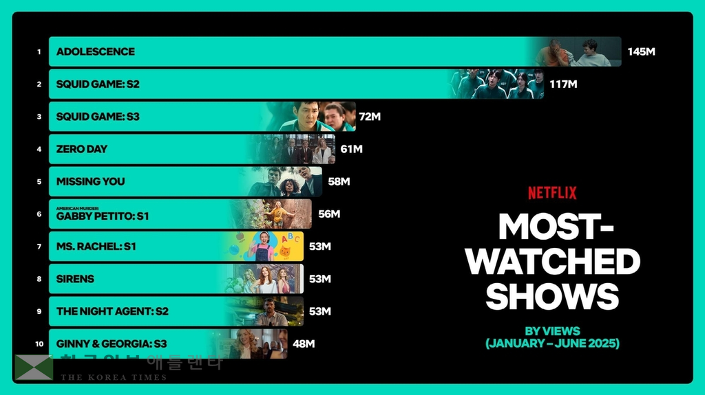 영국의 '소년의 시간'이 시청 수 1억4천500만으로 1위에 올랐고, 덴마크 '우리가 숨겨온 비밀'(3천400만), 스웨덴의 '오레 살인'(3천300만) 등 유럽 시리즈물도 인기를 끌었다.