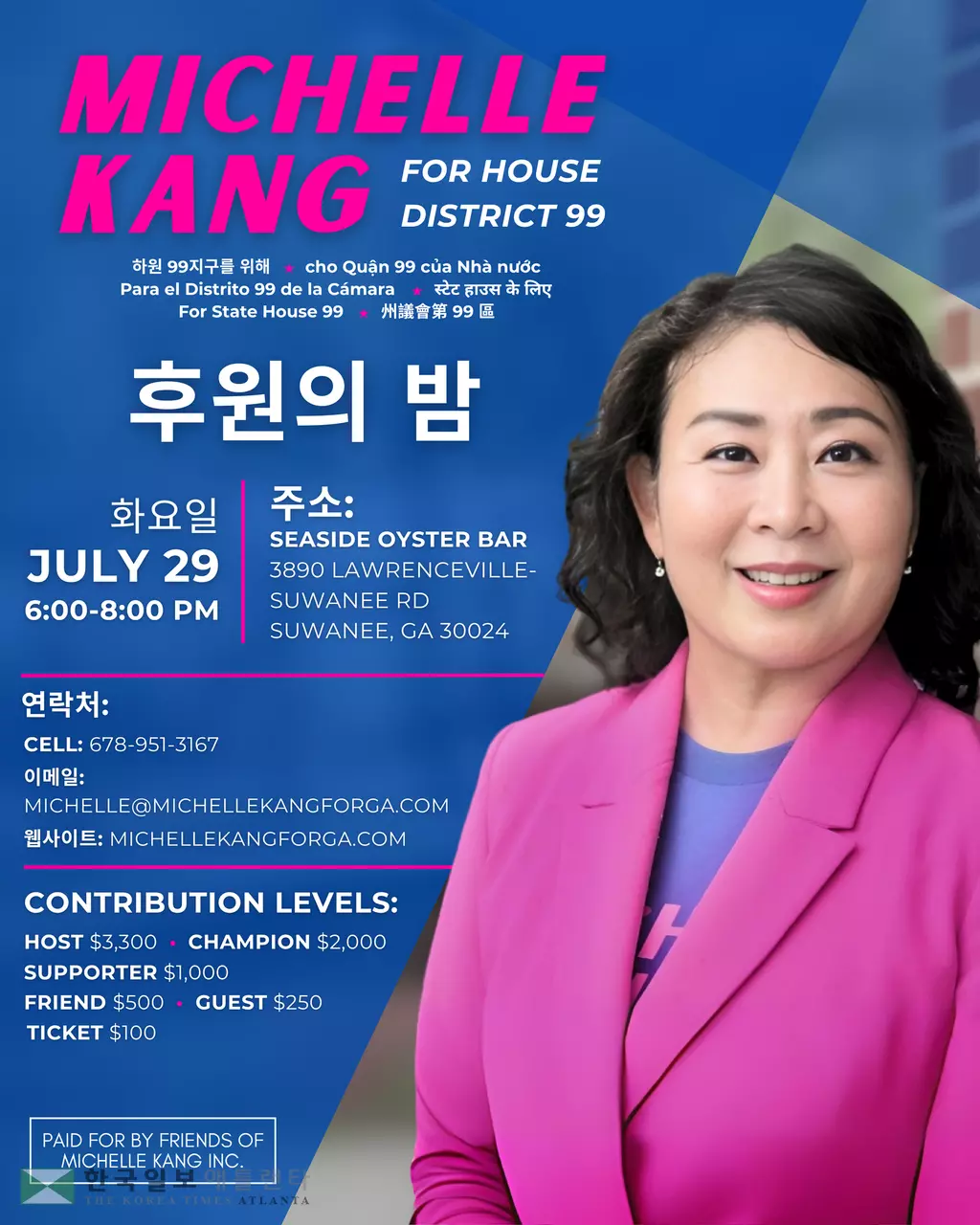 2026년 조지아 주하원의원 조지아 99지역구 선거에 다시 도전하는 한인 미쉘 강 후보를 지원하기 위한 한인 후원회가 7월 29일 화요일 6시 – 8시, 스와니 소재 시사이드 오이스터 바(Seaside Oyster Bar: 3890 Lawrenceville-Suwanee Rd, Suwanee, GA 30024)에서 열린다.