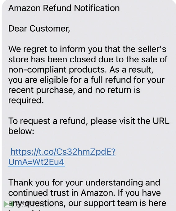 한인 김모씨는 지난 주말 ‘아마존 고객센터’ 명의로 도착한 한 통의 문자 메시지를 받았다. 내용은 “판매자가 규정에 맞지 않는 제품을 판매하여 스토어가 폐쇄됐다. 이에 따라 최근 구매한 제품에 대해 전액 환불을 받을 수 있으며, 반품은 필요하지 않다”는 내용이었다. 그리고 특정 웹사이트에 접속하라는 요청과 함께 웹사이트 주소 및 링크도 함께 담겨 있었다. 얼핏 보면 실제 아마존에서 보낸 것처럼 보이는 메시지였지만, 전문가들은 이는 전형적인 사칭 사기라고 지적한다.