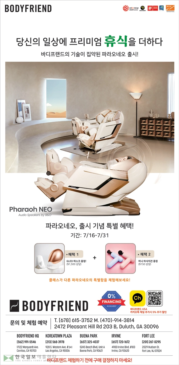 이번 프로모션은 0% 금융 혜택과 함께 제공되며, 바디프랜드 라운지 매장에서 직접 제품을 체험하고 자세한 상담을 받을 수 있다. 애틀랜타 둘루스점: (678) 615-3752 / (470) 914-3814. 박요셉 기자