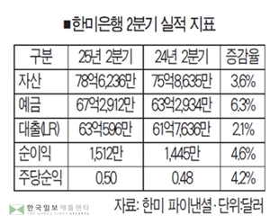 한미은행의 지주사 한미 파이낸셜이 22일 발표한 올해 2분기 순익은 1,512만달러로 전년 동기인 2024년 2분기의 1,445만달러 대비 4.6% 증가했다. 직전 분기인 2025년 1분기의 1,767만달러에 비해서는 14.5% 감소했다.