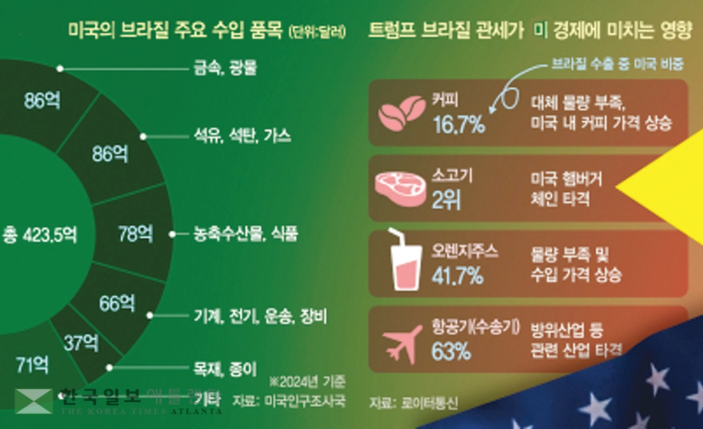 도널드 트럼프 대통령이 8월 1일부터 브라질산 수입품에 50%의 관세를 부과하겠다고 밝힌 가운데 미국 내 커피와 오렌지 주스, 햄버거 등 식료품 가격이 급등할 것이라는 전망이 나오고 있다.