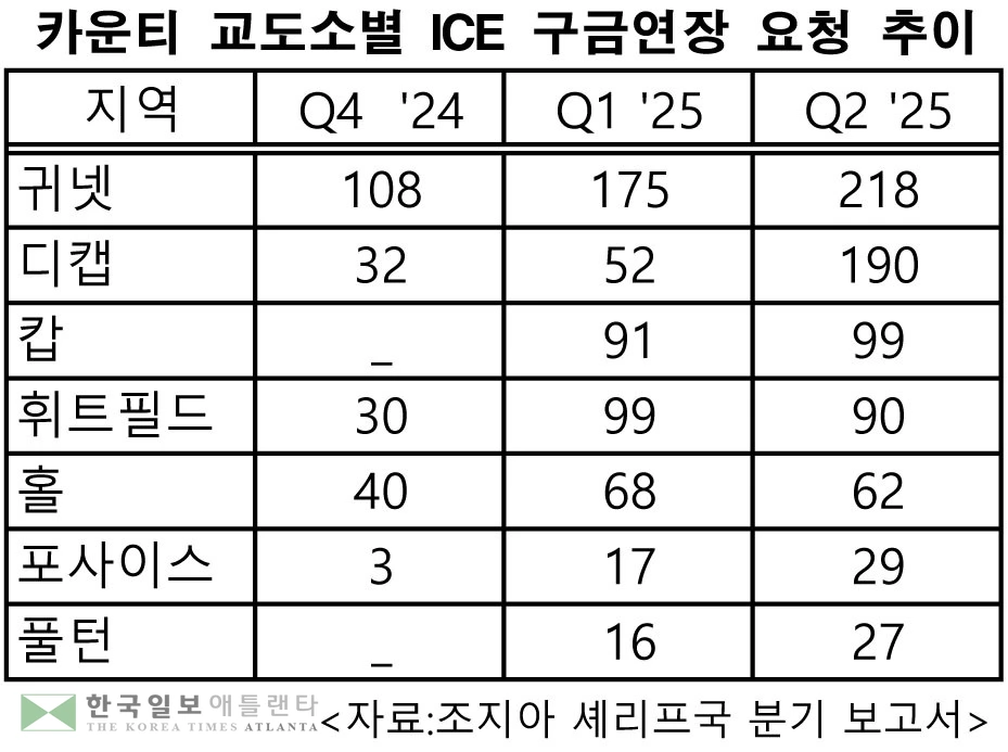 조지아 셰리프국 분기 보고서에 따르면 2025년도 2분기(4~6월) 동안 귀넷 셰리프국은 ICE로부터 수감 이민자 석방 연기 요청을 218건 받은 것으로 확인됐다. 통상 ICE는 현지 교도소 측에 석방예정자를 최대 48시간까지 구금연장 요구를 할 수 있고 그 사이 해당 수감자 신병을 인도 받는다.