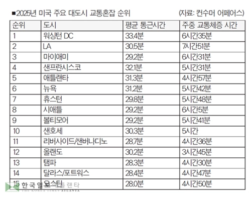 소비자 정보 사이트인 ‘컨수머 어페어스’가 최근 발표한 자료에 따르면 애틀랜타는 평균 출퇴근 시간이 33.1분, 주중 교통체증 시간은 4시간 57분를 기록했다. 특히 애틀랜타는 평균 출퇴근시간만 놓고 보면 워싱턴 DC와 샌프란시스코에 이어 전국에서 세번째로 심한 교통체증을 보였다.