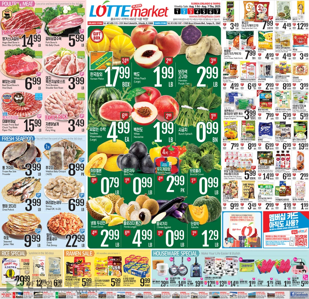 프로듀스 코너에서는 한국참외 BOX 17.99, 백도 LB 1.99, 보라색 고구마 LB 2.99, 씨없는 수박 EA 4.99, 백천도 LB 1.99, 시금치 BN 0.99, 하미멜론 LB 0.79, 검은 자두 LB 0.99, 무지개 피망 PK 2.99, 브로콜리 LB 0.99, 냉동 두리안 LB 2.99, 플로리다 롱간 LB 4.99, 중국가지 LB 0.99, 단호박 LB 1.29에 선보인다.
