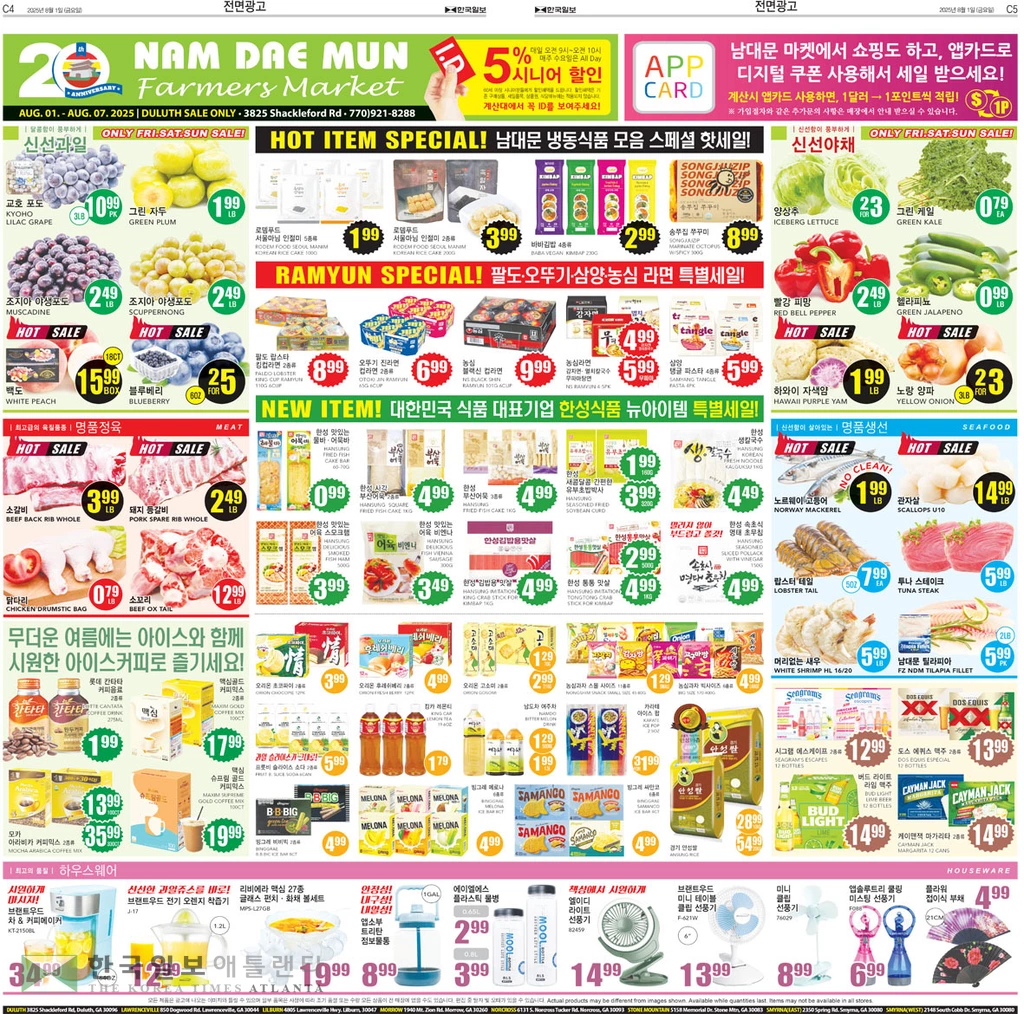 과일 코너에서는 (금/토/일 한정) 한국 참외 박스 17.99,(금/토/일 한정) 백도 복숭아 선물 박스 24.99,교호포도(한국 거봉) 팩(3LB) 12.99,샤인 청포도 팩 8.99,그린자두 파운드 2.99,워싱턴 레드체리 파운3.49,백천도, 복숭아 파운드 2.99,페루 탱고 만다린 박스 34.99에 공급된다.