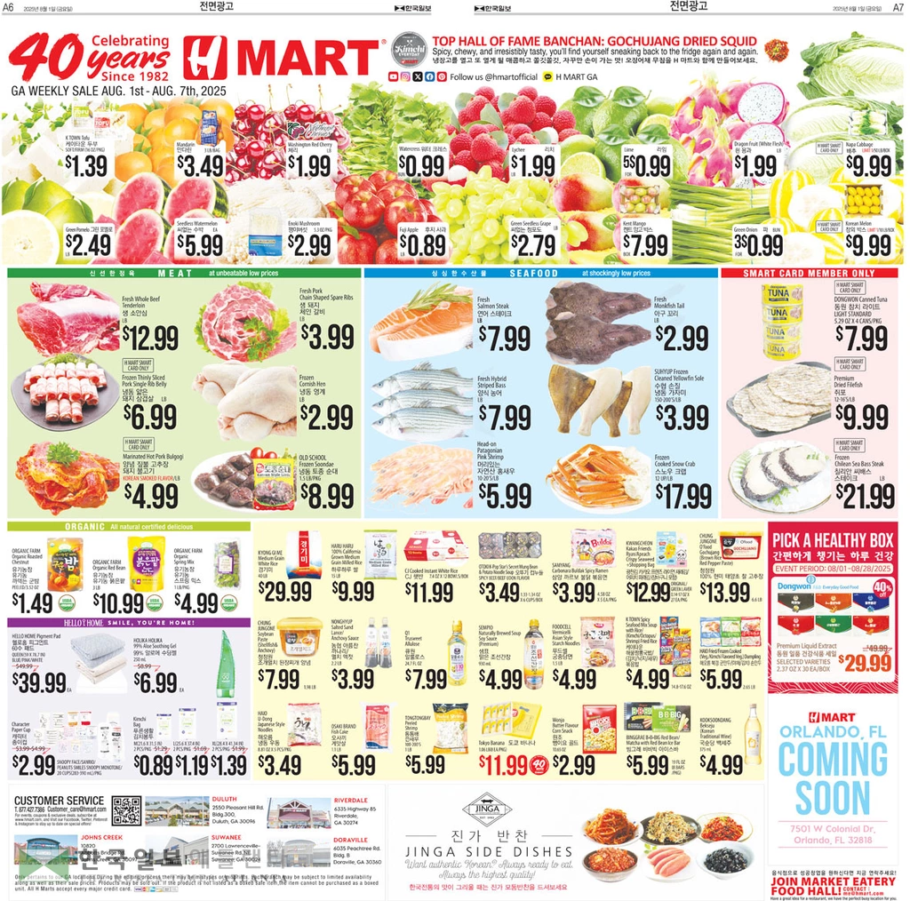 그로서리 코너에서는 서울식품 경기미 40LB EA 29.99, 하루하루마이 15LB EA 9.99, 샘표 맑은조선간장 930ML EA 4.99, 농협 아름찬 까나리액젓 2.2LB(1KG) EA 3.99, 큐원 알룰로스 1/10칼로리 24.70OZ(700G) EA 7.99, 광천 카카오 프랜즈 재래김 장바구니세트(라이언) 0.17OZ/27 EA 12.99,카카오 프렌즈 파래김 장바구니 세트 (어피치) EA 12.99, 햇반 12팩 박스 EA 11.99, 원조 뻥이요 골드(L) EA 2.99, 해오름 냉동우동 (5개입)EA 3.49, 오사끼 게맛살 1.1LB EA 5.99, 케이타운 김치볶음밥 EA 4.99, 해오름 야채손만두 2.65LB EA 5.99, 도쿄 바나나 1.06 LBEA 11.99에 판매된다.