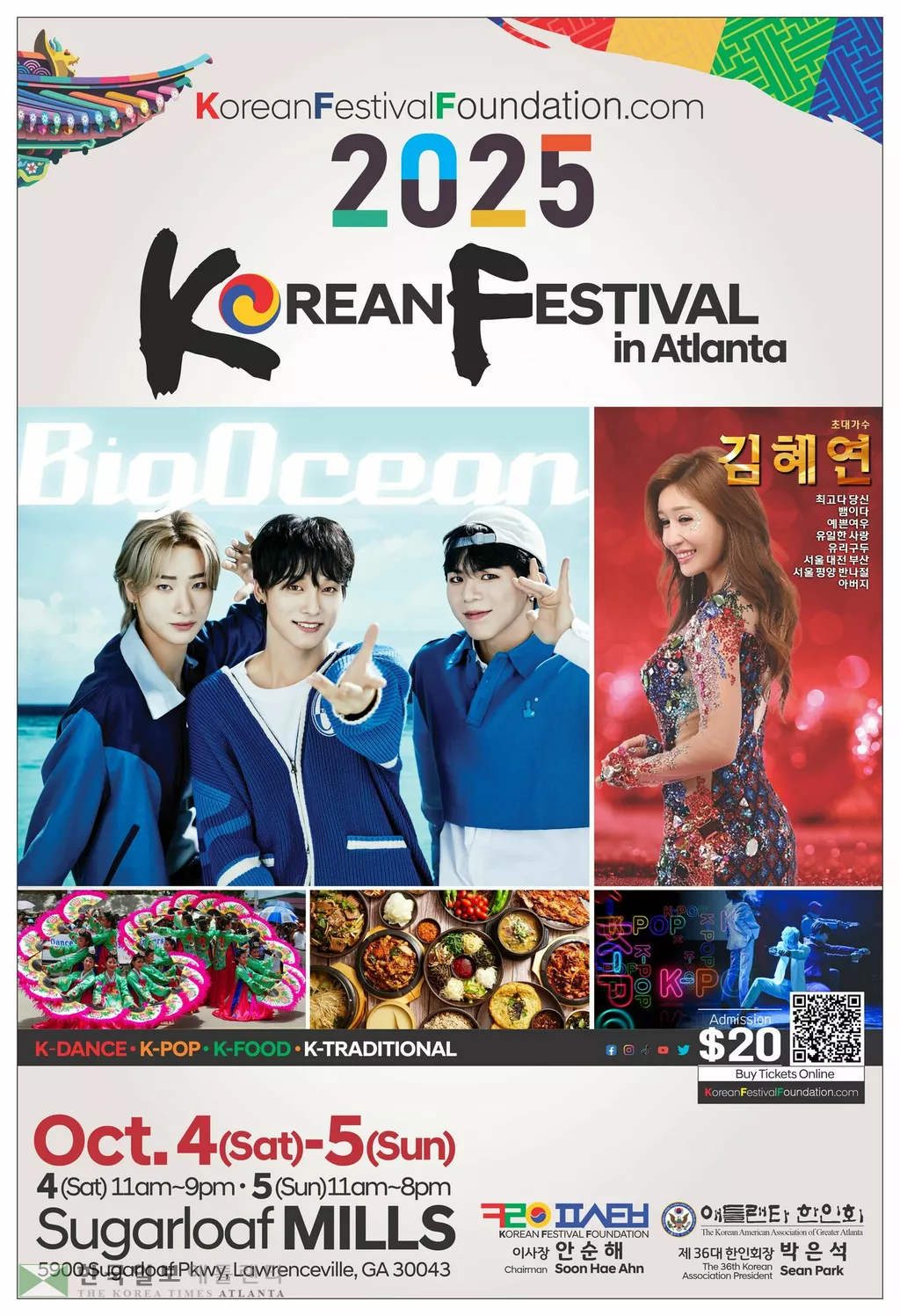 코리안페스티벌재단(이사장 안순해)과 애틀랜타한인회(회장 박은석)이 공동 주최하는 올해 페스티벌은 청각장애를 극복한 세계 최초의 K-Pop 아이돌 그룹인 ‘빅 오션’(Big Ocean), 그리고 트로트의 여왕 가수 김혜연 씨가 초대 가수로 참가자들에게 감동과 흥겨움을 선사할 예정이다.