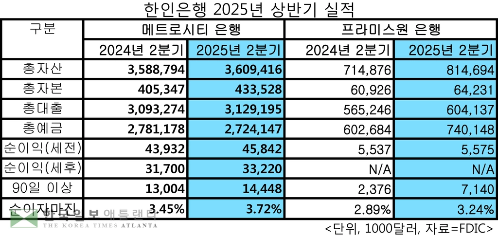 메트로시티은행(회장 백낙영, 행장 김화생)과 프라미스원은행(행장 션 김)이 지난 6월 말까지 올해 상반기 견고한 예금과 대출 성장세를 토대로 순익 증가를 달성했다.