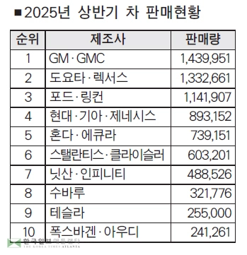 미국 자동차 내수 시장은 올해 상반기 1위부터 4위까지 기존 강자들의 순위가 굳건하게 유지됐다. 제네럴모터스(GM)가 143만9,951대를 판매하며 1위를 수성했고, 도요타는 133만2,661대로 2위, 포드는 114만1,907대로 3위를 지켰다. 같은 기간 현대차그룹은 89만3,152대를 판매하며 포드를 맹추격했다.