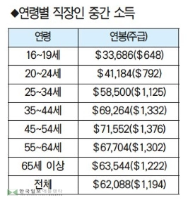 연령별로는 45~54세가 7만1,552 달러로 가장 높았으며 55세를 정점으로 소득이 줄어들어 65세 이상은 6만3,544달러를 받는 것을 나타났다.