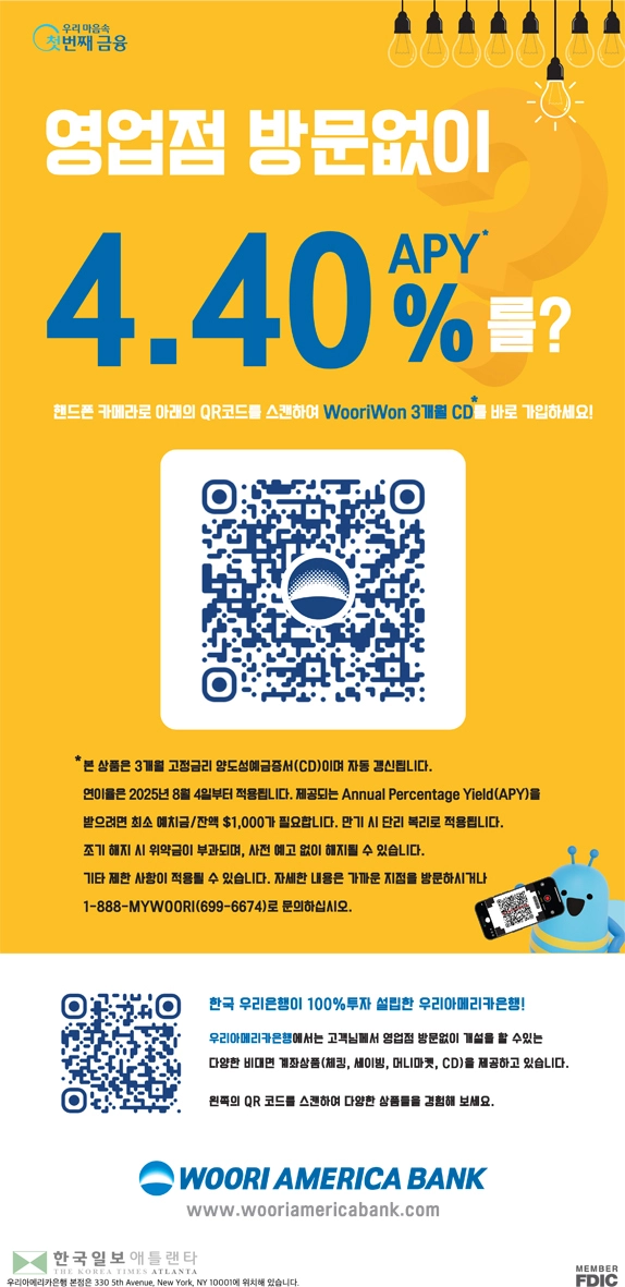 우리아메리카은행은 이번 서비스 출시와 함께 최대 연 4.4%의 금리(3개월 만기 기준)를 제공하는 ‘우리 WON CD’ 등 ‘우리 WON 비대면 수신 상품’ 4종(우리 WON 체킹, 머니마켓, 세이빙스 포함)을 함께 선보인다.