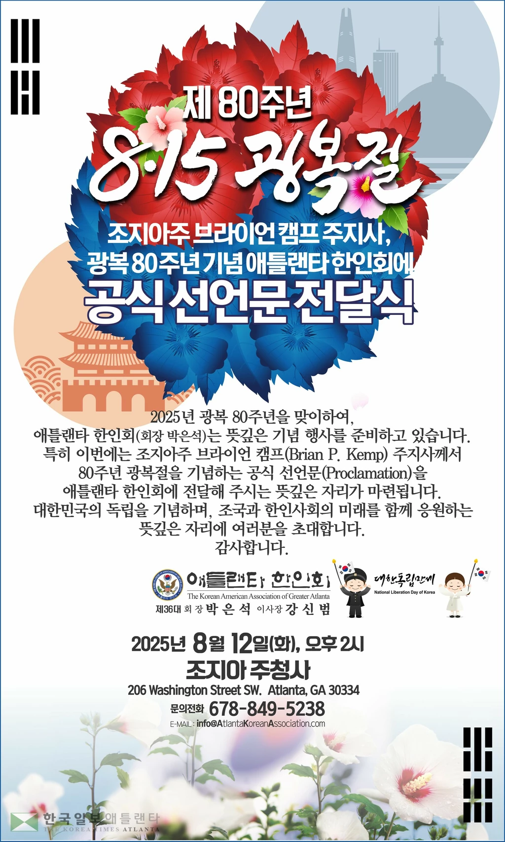 애틀랜타 한인회(회장 박은석)는 오는 15일 오후 6시 애틀랜타 한인회관에서 광복 80주년 기념 행사를 개최한다.