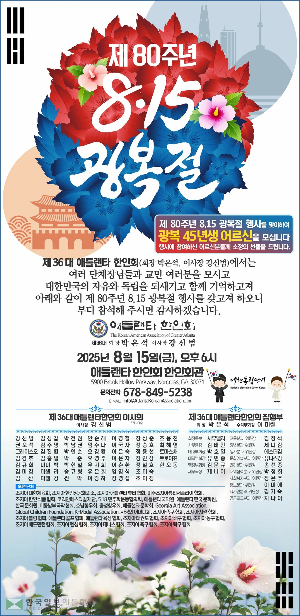 박은석 한인회장은 “대힌민국의 독립을 기념하며, 조국과 한인사회의 미래를 함께 응원하는 뜻깊은 자리에 여라분을 초대한다” 고 말했다. 박 회장은 "동포들의 성금으로 마련된 한인회관을 특정 세력만 이용하고 다수의 한인들이 출입이 금지되고 봉쇄되는 것은 말이 안된다"며 "동포들의 공동 재산인 한인회관에서 반드시 광복절 행사를 개최하겠다"고 결의를 밝혔다. 문의) 678-849-5238. 박요셉 기자